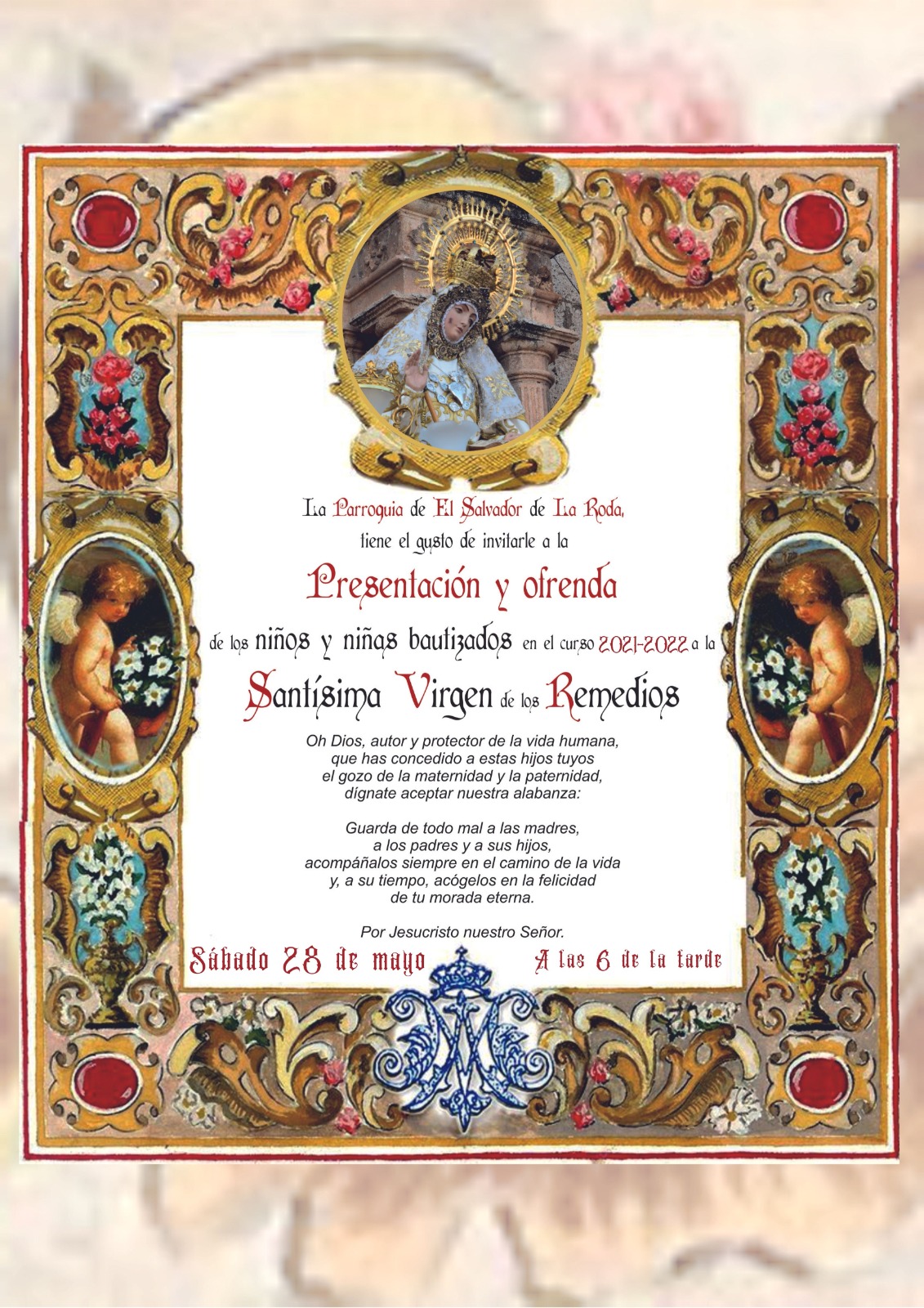 Este próximo sábado 28 de mayo, a las 18h., en la iglesia de El Salvador, tendrá lugar la presentación de los niños que fueron bautizados desde la última estancia de la Virgen hasta hace unos días. Serán presentados a nuestra querida Virgen María en su advocación de los Remedios. Sin duda un momento muy especial, acompañar a los últimos pequeños bautizados en nuestra Parroquia, a los pies de la Virgen.